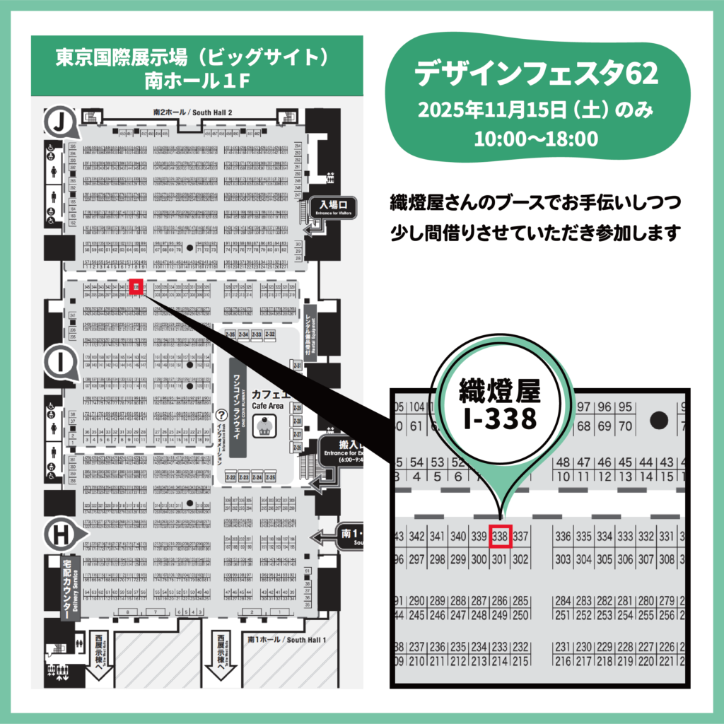 デザインフェスタvol.62ですが、抽選に落ちてしまいましたがお友達の織燈屋さんにブースでお手伝いしつつ、間借りさせていただくことになりました。