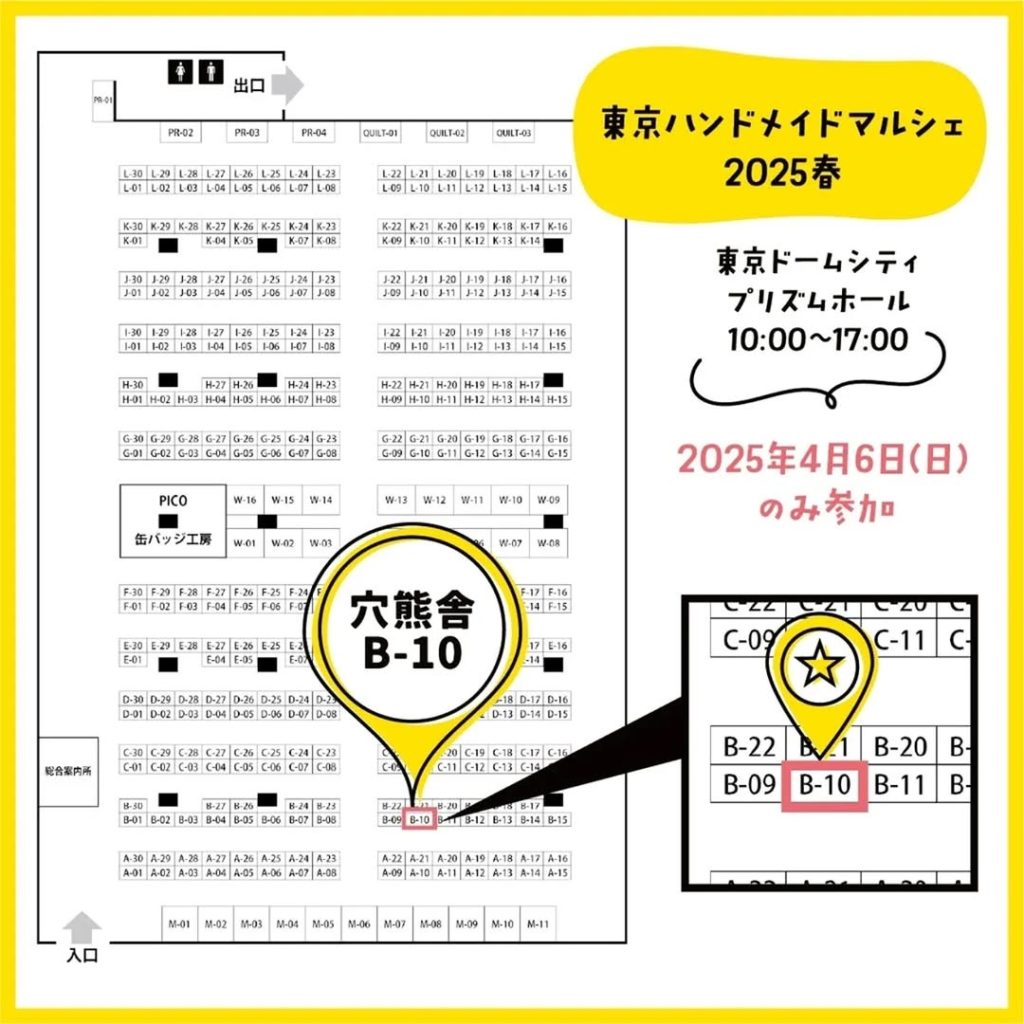 1 4月 2025 4/6 東京ハンドメイドマルシェ 出店します by yama_mudina1011 | posted in: Event, お知らせ | 0 東京ハンドメイドマルシェ出店します。 4/6(日)のみ、B-10におります。ミニ針山多目に持っていく予定です。よろしくお願いします。東京ハンドメイドマルシェ
